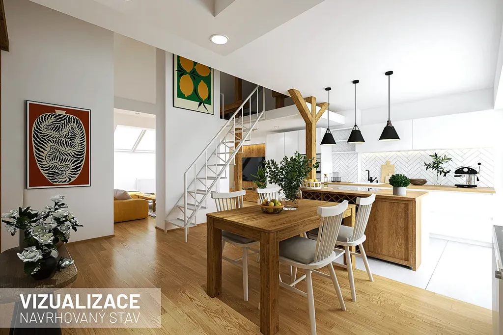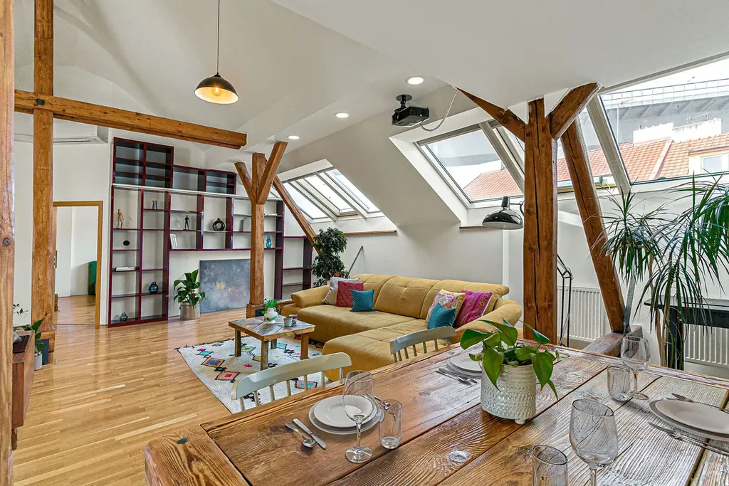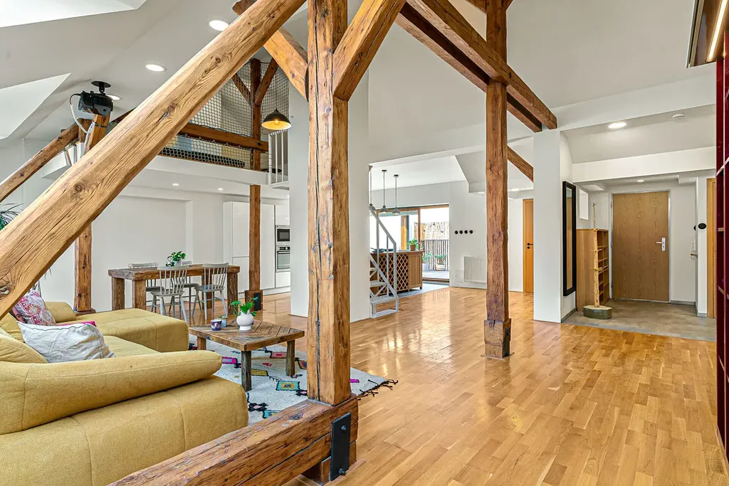 Vstoupíte – a okamžitě víte, že tento byt je jiný. Vysoké stropy, masivní trámy a světlo proudící střešními okny vytvářejí jedinečný prostor s duší. Když k tomu přidáte soukromou terasu, je jasné, že tohle je bydlení, které se nevidí každý den.
