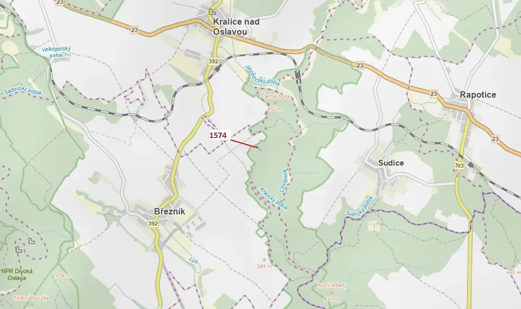 Lesní pozemek o výměře 885 m2, parcelní číslo 1574, podíl 1/1, katastrální území Březník, obec Březník, obec s rozšířenou působností Náměšť nad Oslavou, okres Třebíč, Kraj Vysočina.