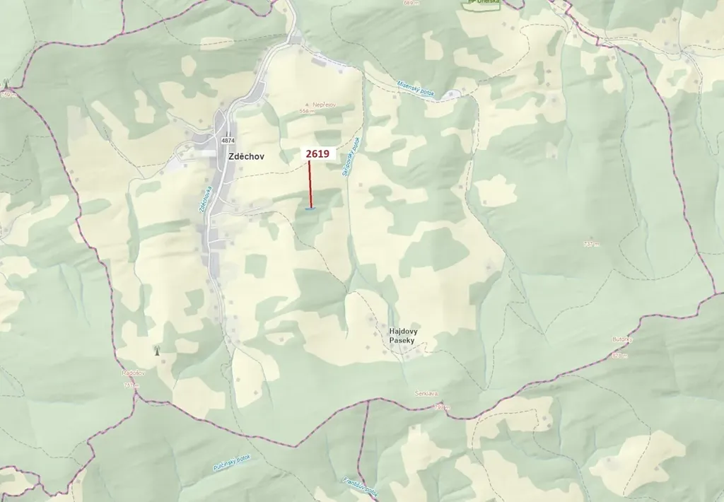 Lesní pozemek o výměře 867 m2, parcelní číslo 2619, podíl 1/1, katastrální území Zděchov, obec Zděchov, obec s rozšířenou působností Vsetín, okres Vsetín, Zlínský kraj.