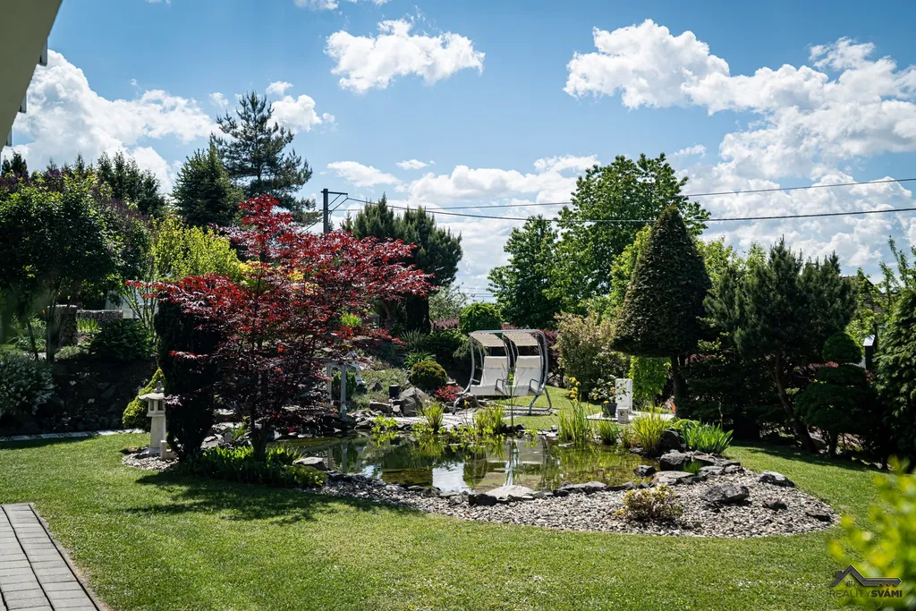 Zahrada je pečlivě navržená, s důrazem na estetiku i funkčnost – upravené okrasné dřeviny, promyšlené rozmístění záhonů a harmonické propojení s okolní přírodou vytvářejí dokonalé místo pro odpočinek.