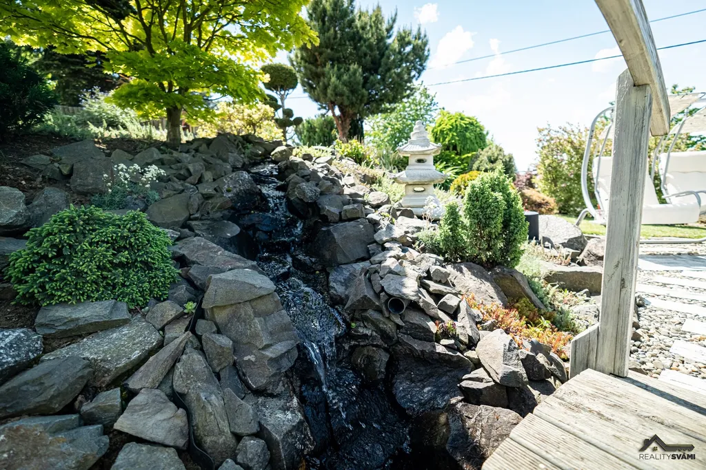 Najdete zde zastřešený bazén s protiproudem, romantické jezírko s potůčkem, KOI kapry i jesetery, jižně orientovanou krytou terasu poskytující klid a naprosté soukromí. Okrasné dřeviny, ovocné stromy, zeleninové záhony a zahradní domek se sklípkem dotvářejí prostředí, které působí harmonicky a zároveň prakticky.