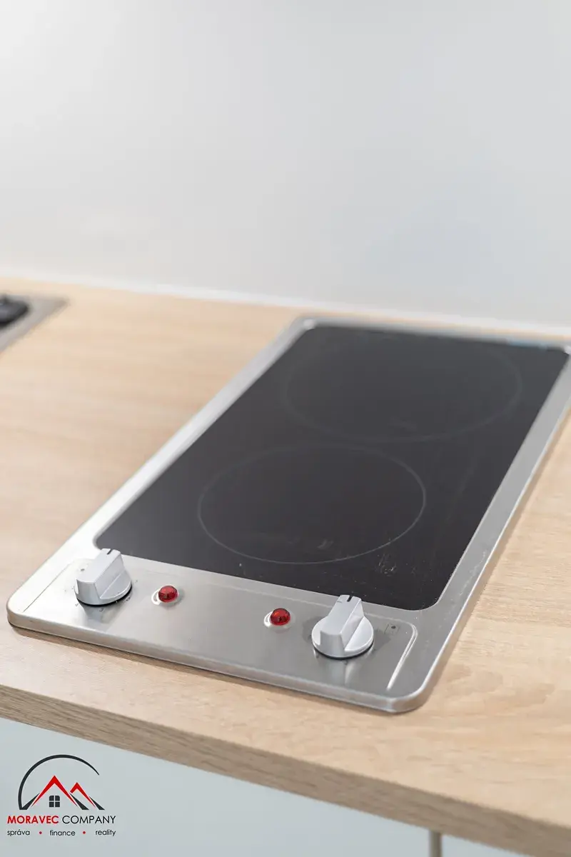 Vybavení bytu zahrnuje kuchyň s indukční varnou deskou, zabudovanou lednicí a mikrovlnnou troubou, koupelna je vybavena sprchovým koutem, praktickou skříňkou na hygienické potřeby a WC. Ohřev vody zajišťuje elektrický bojler.