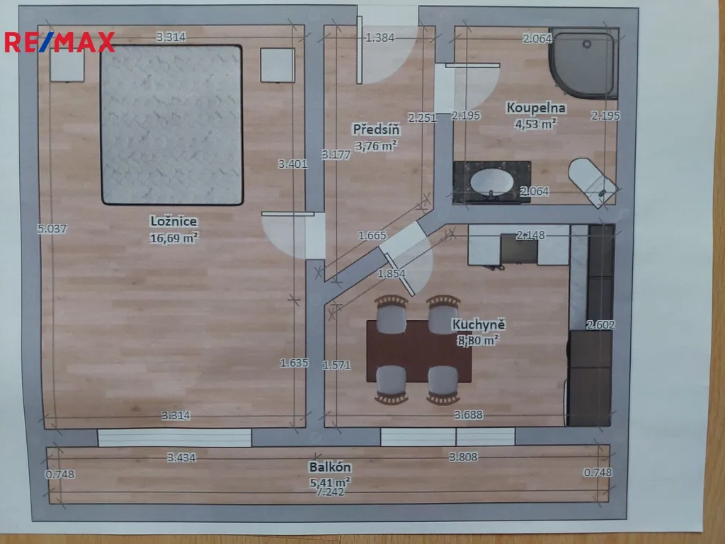 Z kuchyně se dostanete na slunný balkón/terasu cca 5,5 m2.