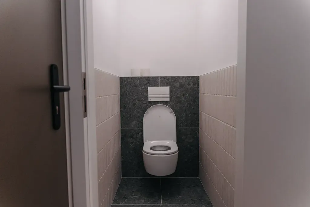 Koupelna je zpracována ve velmi vysokém standardu, s kvalitními obklady, moderní sanitou a designovou sprchovou zástěnou, což podtrhuje celkový prémiový charakter bytu. K bytu náleží také sklepní kóje a garážové parkovací stání přímo v domě.
