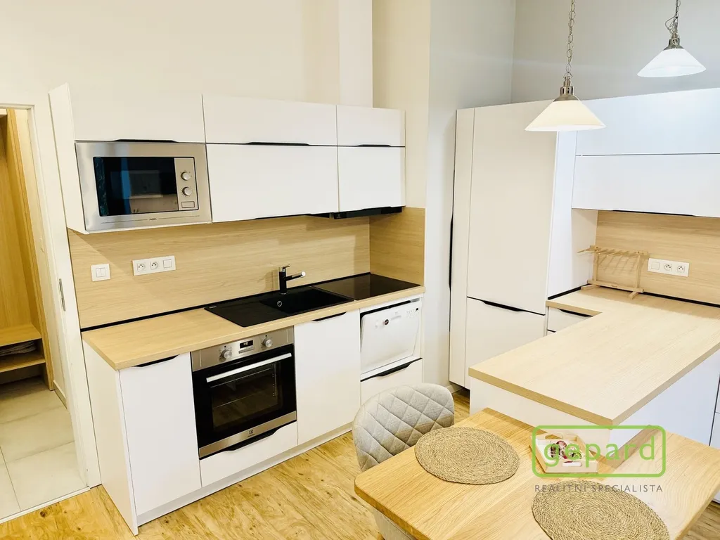 • Kuchyň: linka na míru s vestavnou lednicí s mrazákem, varná deska, pečicí trouba, vestavná myčka, jídelní stůl se židlemi
