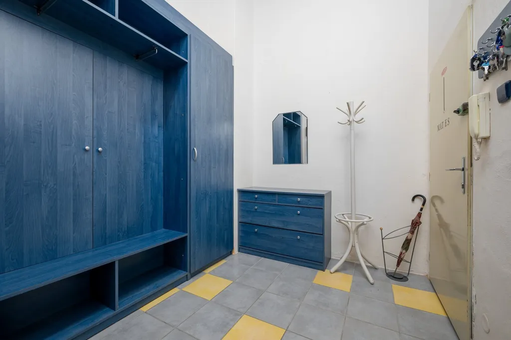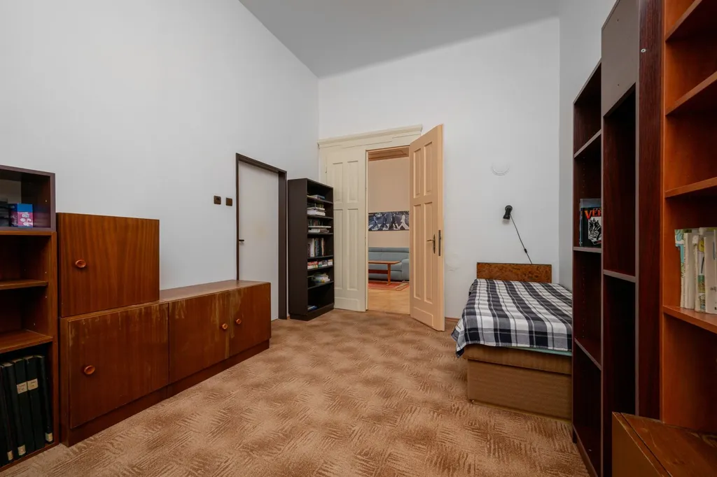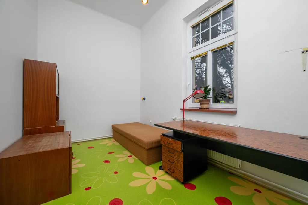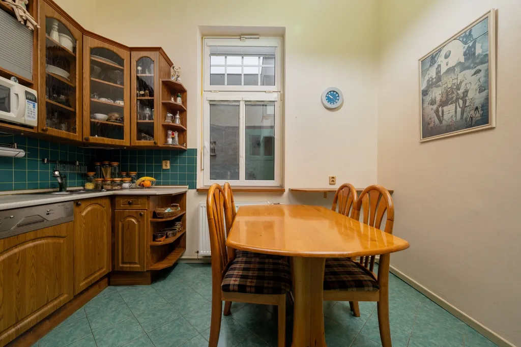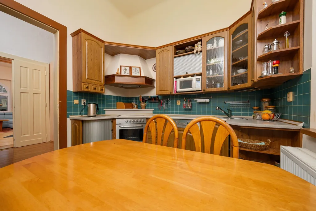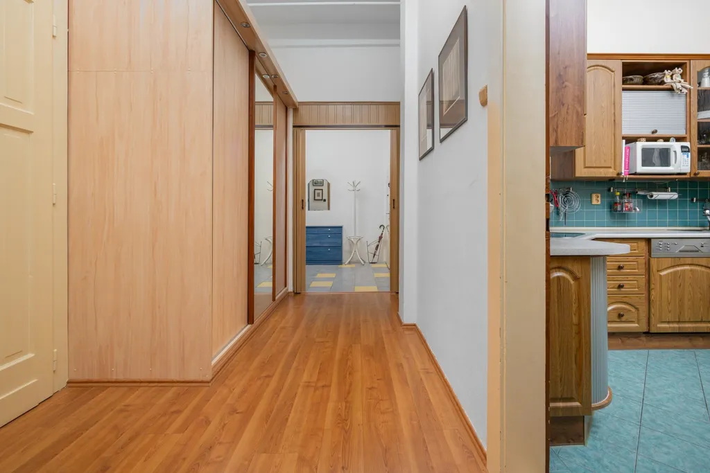 Dispozice bytu je velmi variabilní a nabízí dostatek soukromí i pro větší rodinu. Interiéru dominuje centrální vstupní hala o výměře necelých 19 m², která propojuje jednotlivé části bytu. Obytný prostor tvoří celkem pět pokojů. Největší z nich, obývací pokoj, má výměru přes 24 m². Dále jsou zde k dispozici tři prostorné pokoje vhodné jako ložnice či dětské pokoje a pátá, menší místnost o velikosti necelých 9 m², která je ideální pro využití jako pracovna nebo pokoj pro hosty. Kuchyně s jídelním koutem o výměře 11 m² je doplněna o praktickou spíž. Koupelna je společná s toaletou a je vybavena rohovou vanou se sprchovou zástěnou. Úložné prostory přímo v bytě rozšiřuje komora a k jednotce dále náleží velký zděný sklep o výměře přibližně 12 m².