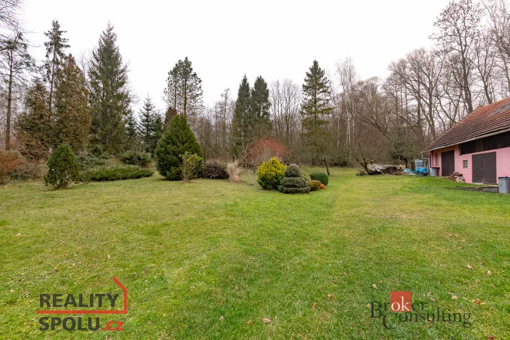 Součástí nemovitosti je zahrada o výměře 2 359 m² se vzrostlými stromy, které poskytují dostatek stínu i soukromí. Za domem navazuje les, takže jedinými „sousedy“ jsou zde především lesní zvířata.