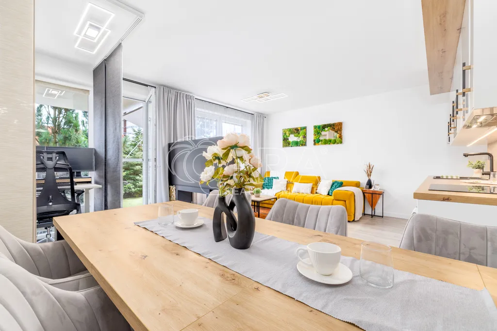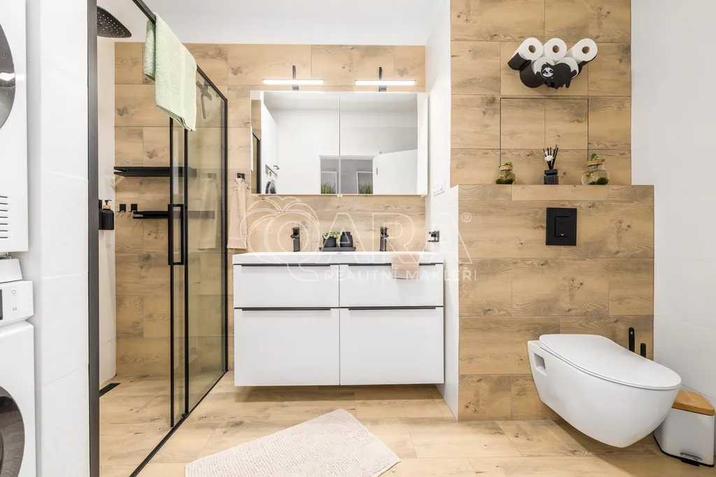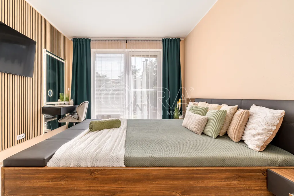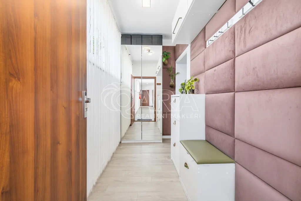 Byt prošel kompletní designovou úpravou a rekonstrukcí koupelny a disponuje vstupní chodbou, praktickou spíží, prostorným obývacím pokojem s moderní kuchyní, jídelním koutem a pracovním prostorem, ložnicí, šatnou a koupelnou s WC. Dominantou bytu je velká terasa o výměře 52 m² orientovaná na východ s možností umístění posezení, vířivky či sušení prádla. Z obou hlavních místností je přímý výstup na terasu. Součástí je také kolárna sdílená pouze se dvěma dalšími byty.
