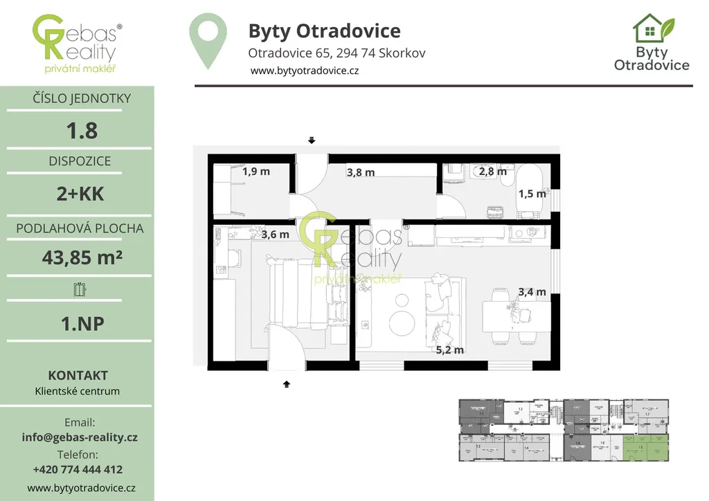 Ve výhradním zastoupení si Vás dovolujeme oslovit nabídkou moderní bytové jednotky o dispozici 2+KK a celkové užitné ploše 45,6 m², která se nachází v kompletně zrekonstruovaném bytovém domě v obci Otradovice – Skorkov pouhých 5 minut od Brandýsa nad Labem – Staré Boleslavi. Projekt Byty Otradovice zahrnuje celkem 16 bytových jednotek různých velikostí a nabízí kvalitní a komfortní bydlení v klidné lokalitě s výbornou dostupností do Prahy, Brandýsa nad Labem – Staré Boleslavi i Mladé Boleslavi. Součástí kupní ceny je parkovací stání před domem, kuchyňská linka vyrobená na míru od truhláře včetně vestavných spotřebičů, kompletní sanita v koupelně značky JIKA a zděný sklep o minimální ploše 15 m² umístěný v suterénu domu.