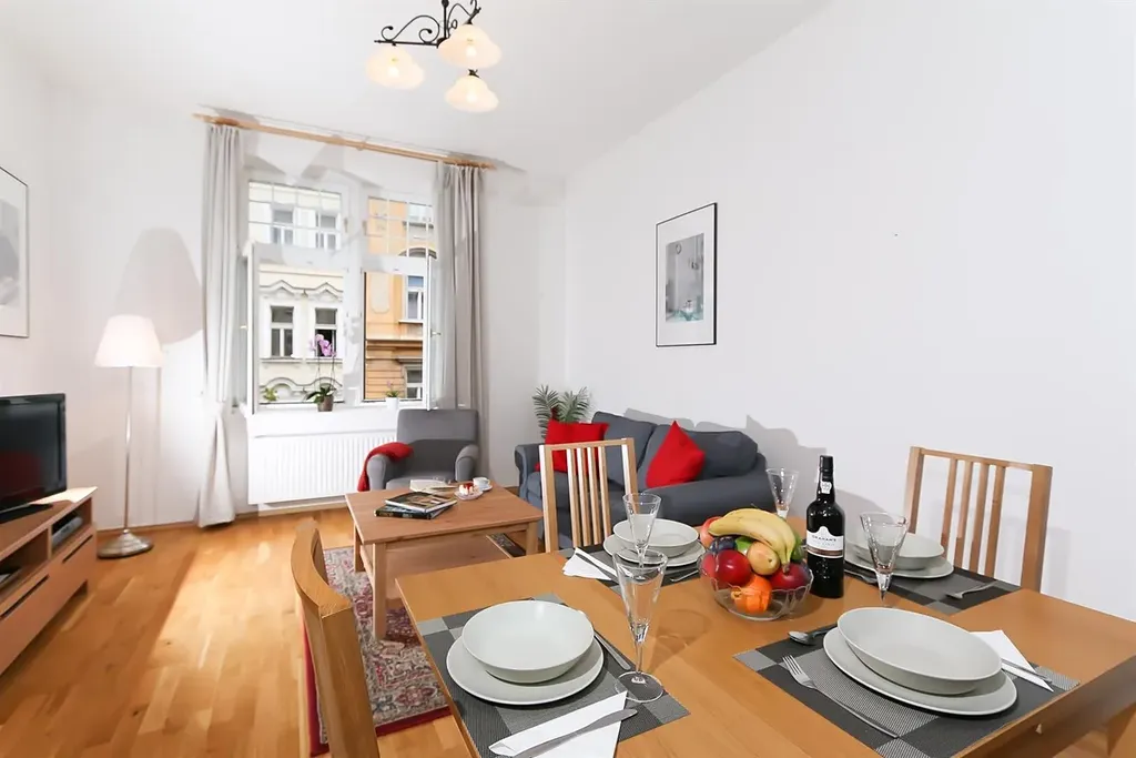 Byt je kompletně zařízený a dispozičně nabízí vstupní chodbu, prostorný obývací pokoj s jídelním koutem a moderní kuchyňskou linkou, plně vybavenou vestavěnými spotřebiči (elektrická varná deska, trouba, lednice, mikrovlnná trouba), samostatnou ložnici s okny směřujícími do klidného dvora a koupelnu s umyvadlem, sprchovým koutem, toaletou a pračkou. Mezi další příslušenství patří TV se satelitem, WiFi. Na podlahách jsou parkety a dlažba.