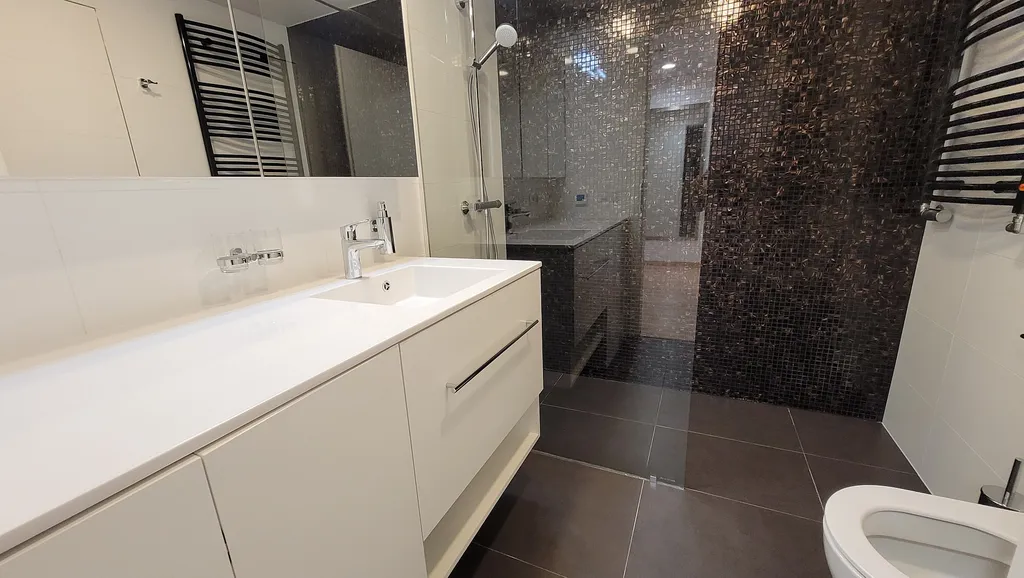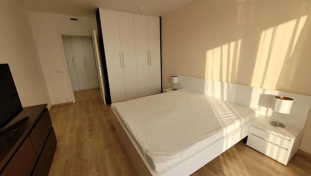 Velice pěkný byt č. 1204 o dispozici 2+kk s atypickou obloukovou terasou, elektrickými venkovními žaluziemi a výhledem z 12. patra moderní budovy. Byt je kompletně zařízený a naleznete v něm tedy veškerý nábytek a vybavení, a to i včetně nádobí či přikrývek! V koupelně vás jistě potěší příjemné podlahové vytápění a moderní sprchový kout walk-in. Vysokorychlostní internet v ceně je samozřejmostí.