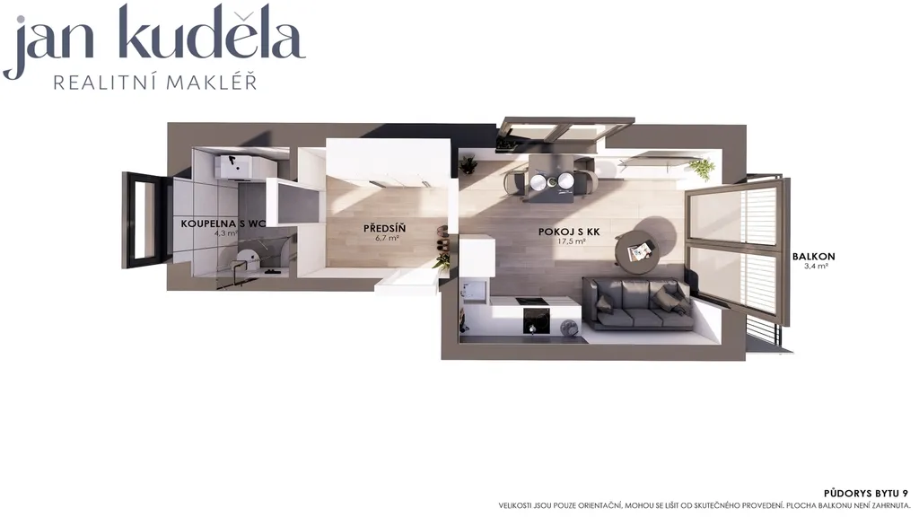 Při vstupu do bytu se nacházíte v předsíni a bude vybavena vestavěnou skříní přes celou šířku chodby, která poskytuje nadstandardní úložný prostor. Z předsíně je vstup do koupelny se sprchovým koutem, toaletou a místem pro pračku. Hlavní obytný prostor je propojen s kuchyňským koutem, který bude vybavenen vestavěnou myčkou, troubou, indukční varnou deskou, Z pokoje je vstup na balkon orientovaný do klidné části okolí. Byt je vybavený klimatizační jednotkou.