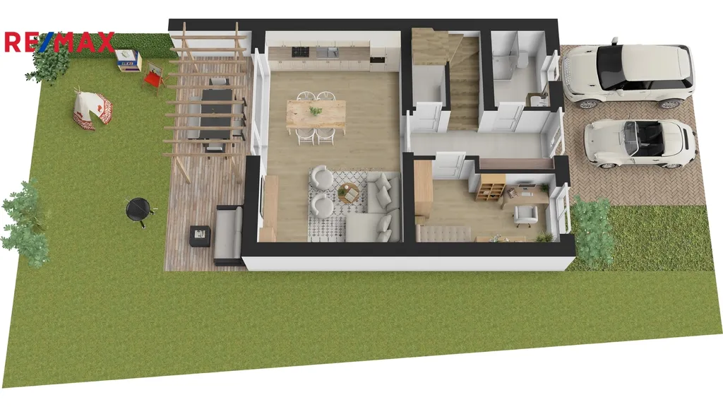 V přízemí domu bude vstupní chodba se schodištěm do patra, kde při vstupu budete mít po pravé straně koupelnu se sprchovým koutem a WC, na levé straně bude výklenek pro vestavěnou šatní skříň. Dále menší pokoj vhodný jako ložnice nebo pracovna. Rovně z chodby projdete do velkého obývacího pokoje, který bude spolu s velkým kuchyňským koutem a jídelnou dominantou celého domu. Z tohoto obývacího pokoje bude vstup na zahradu s terasou, kde si můžete postavit pergolou. Zahrada bude oplocená se zadní brankou pro pěší vstup. V chodbě domu pod schodištěm budete mít úložný prostor a v patře na vás budou čekat tři pokoje a hlavní koupelna s vanou a WC. Jako bonus vám zhotovíme plnohodnotnou velkou místnost v podkroví, kam povede běžné schodiště. Podkrovní pokoj bude mít všechny náležitosti jako jsou střešní okna, podlahovou krytinu, sádrokartonové podhledy i rozvody elektřiny. Tento podkrovní prostor můžete využít jako ložnici, pracovnu nebo hernu. Velkoformátová okna zajistí dostatek přirozeného světla a příprava na venkovní žaluzie umožní regulaci teploty v interiéru. Před domem budou dvě parkovací stání. Tepelné čerpadlo bude umístěné směrem do ulice.