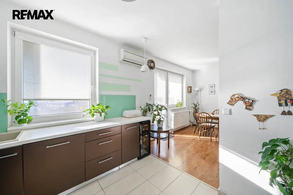 Dominantou bytu je prostorná kuchyň propojená s obývacím pokojem, ze kterého je vstup na balkon. Druhý balkon je přístupný z jednoho ze samostatných pokojů. Kuchyňská linka je vybavena vestavěnými spotřebiči – mikrovlnnou troubou, elektrickou troubou, sklokeramickou varnou deskou a digestoří. V obývacím pokoji na naistalována klimatizace.