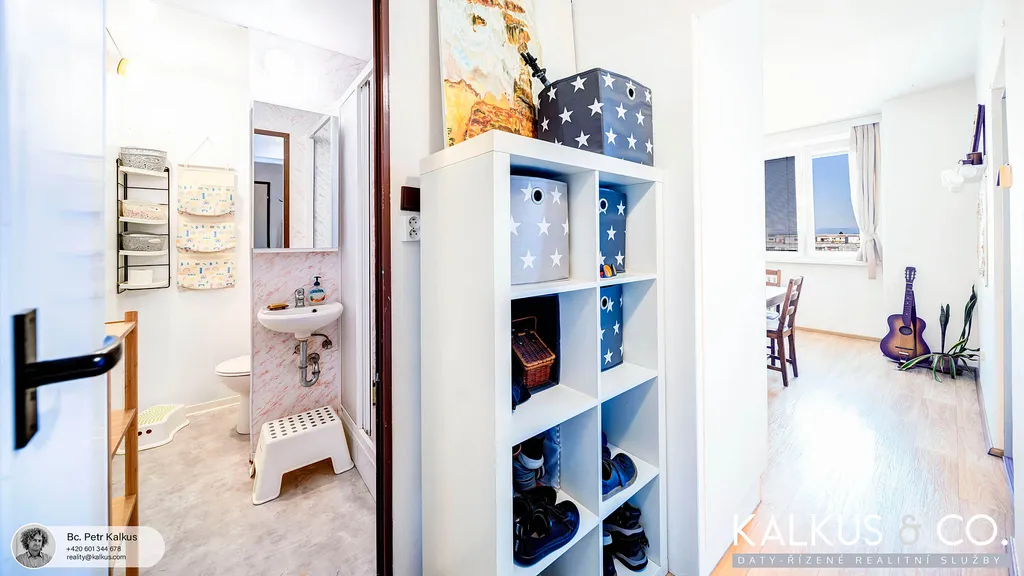 Byt je po částečné rekonstrukci ve velmi dobře udržovaném stavu. V centru dění se nachází obývací pokoj společný s novou kuchyňskou linkou a jídelnou (cca 16.35 m²). Po stranách obývacího pokoje je dětský pokoj (cca 17.79 m²) a ložnice (14.14 m²) s lodžií. V původním jádře je koupelna se sprchovým koutem společná s WC.