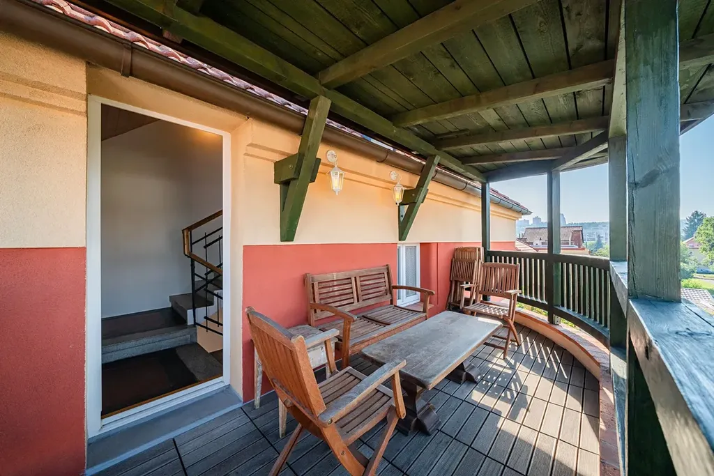 Mezipatro: Zastřešená terasa se sedacím nábytkem – ideální pro ranní kávu nebo večerní relax.