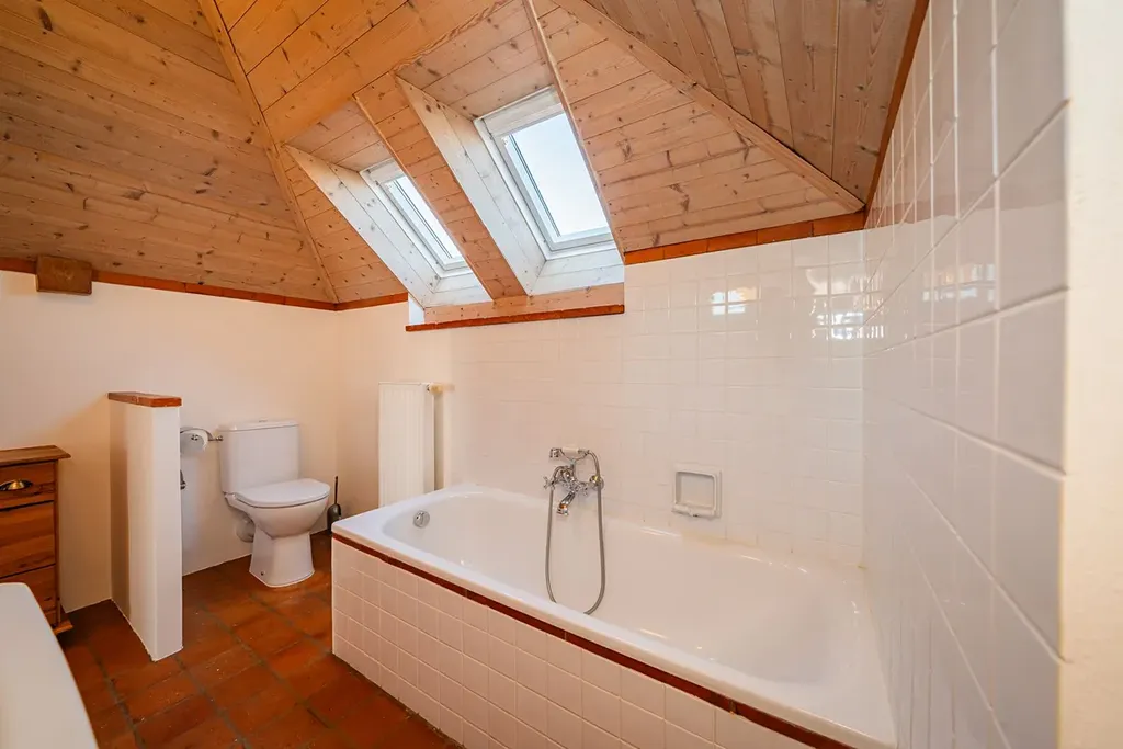 2. NP (hlavní obytné patro): Stylová kuchyň se značkovými spotřebiči a spíží, prostorný obývací pokoj s balkonem do ulice a oknem do zahrady, ložnice, koupelna s vanou, pračkou a kombinovaným plynovým kotlem, samostatné WC.