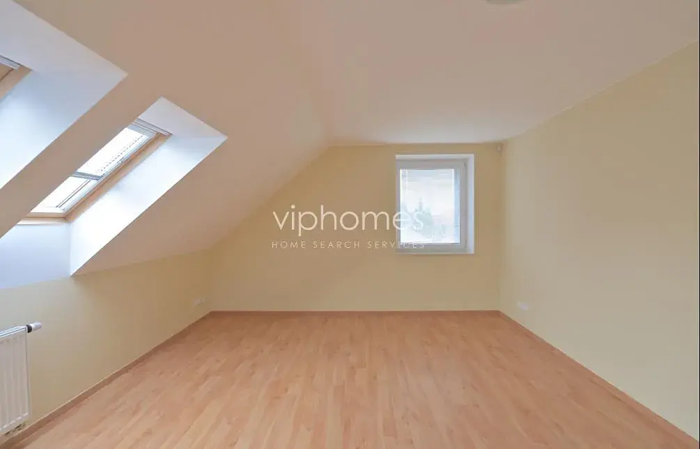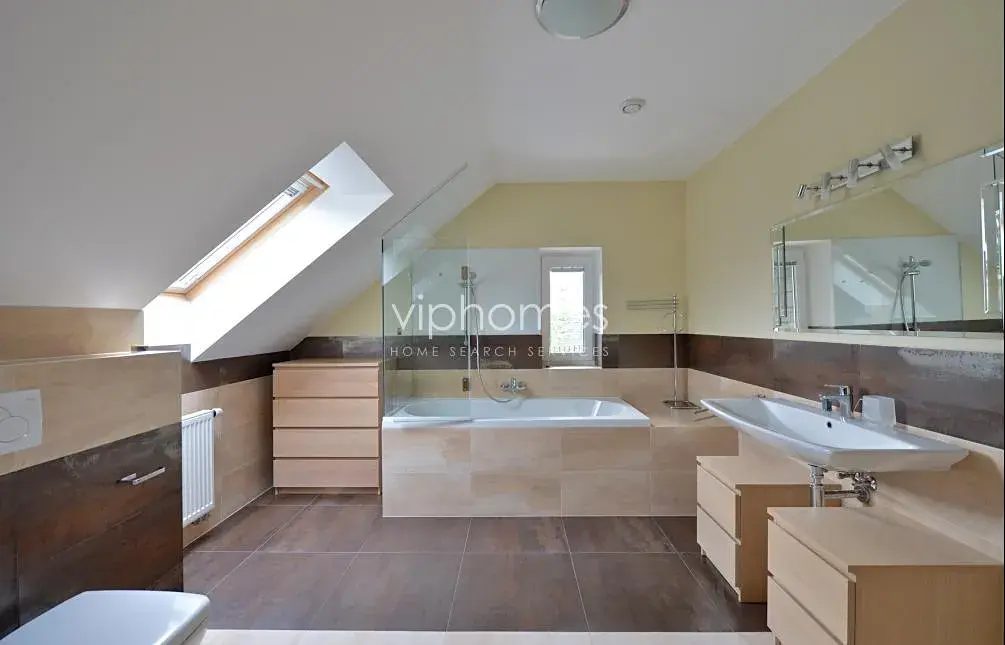 Dům nabízí v přízemí obývací pokoj s plně vybaveným kuchyňským koutem a vstupem na terasu a vzrostlou zahradu, pokoj pro hosty ze sociálním zázemím, prádelnu se sušičkou a pračkou, komoru. V patře je umístěna hlavní ložnice s vlastní koupelnou a další 3 ložnice, ke kterým náleží koupelna se sprchou a WC. Suterén domu - kotelna, sklad- velká místnost. Dubové a plovoucí podlahy, schodiště s obkladem z mramoru, krb, bezpečnostní vstupní dveře. V přízemí domu jsou nové elektrické rolety, francouzská okna, alarm, internet, satelitní TV připojení. Celý dům je klimatizován. Zahrada s opravdovým soukromím. Dům není zařízený nábytkem, ale je zde množství vestavěných skříní a 2 šatny. Garáž pro 2 vozy, dálkově ovladatelná vrata + jedno stání na pozemku pod uzavřením.