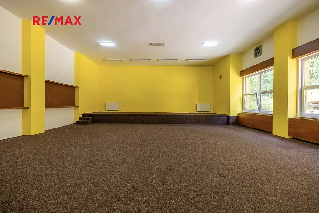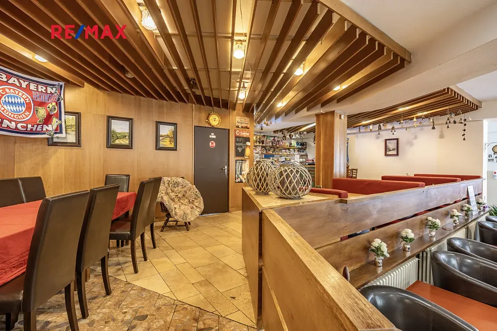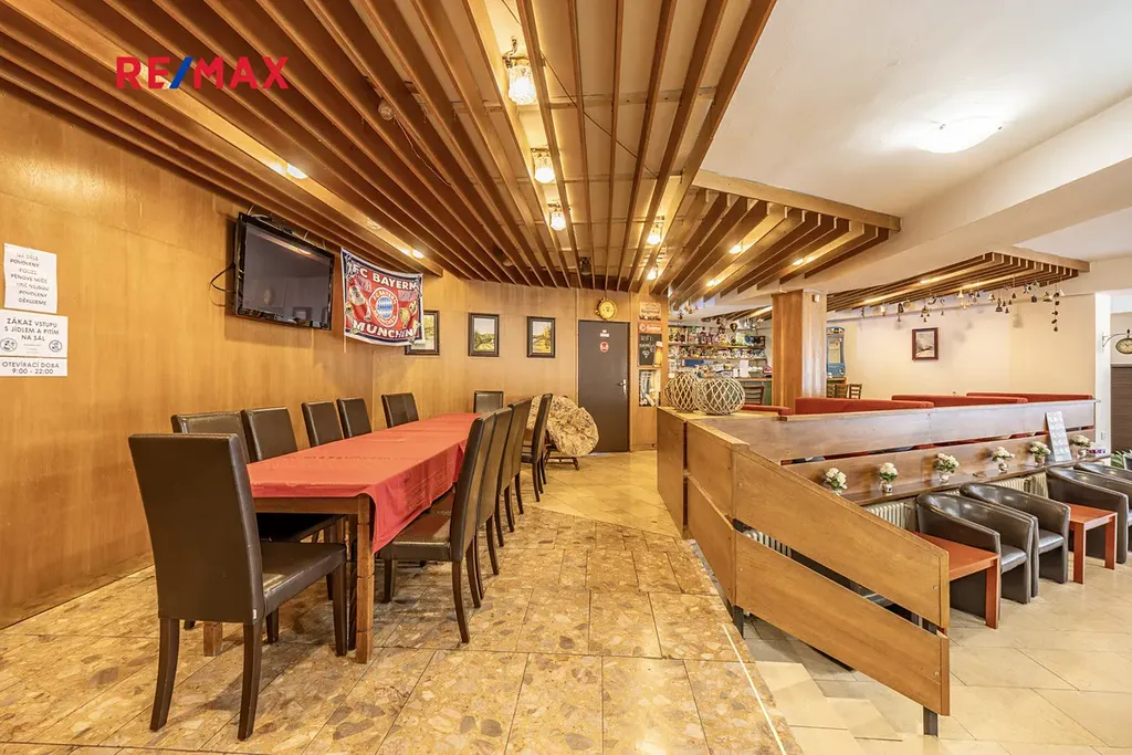 Uvnitř penzionu se nachází vybavená jídelna s kapacitou pro 150 osob, dvě společenské místnosti a prostorný multifunkční sál, ideální pro cvičení, projekce, divadelní představení či firemní akce. Kvalitně vybavená kuchyně umožňuje zajištění stravovacích služeb. Součástí komplexu je také bar s příjemným posezením a terasa v 1. patře, která slouží k odpočinku. Dále je k dispozici samostatná recepce/kancelář a soukromý byt 3 + 1 s vlastním vstupem vhodný pro správce nebo majitele. Menší posilovna se sprchami přidává další hodnotu této nabídce.