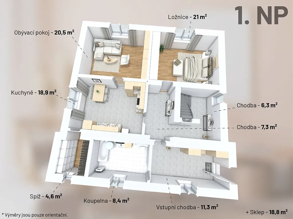 Dům je částečně podsklepený, ve sklepě je kotelna s automatickým kotlem na uhlí/pelety. Užitná plocha sklepa je cca 20 m².