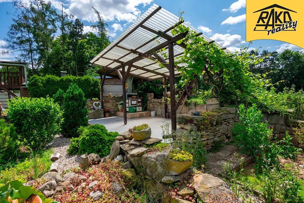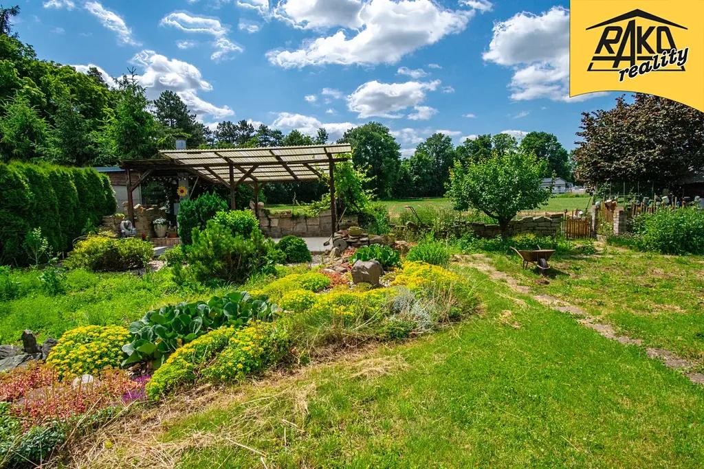 Okolo domu, a hlavně za domem, se rozprostírá velmi pěkná udržovaná zahrada se spoustou okrasných květin a keřů. Původní majitelka byla totiž byla vášnivá zahradnice. Na zahradě je dále k dispozici menší dřevěná pergola s venkovním grilem a zpevněnou podlahou. Dále na zahradě najdeme menší zahradní domek, který dříve sloužil slepicím, nyní je využíván jako sklad zahradního nářadí.