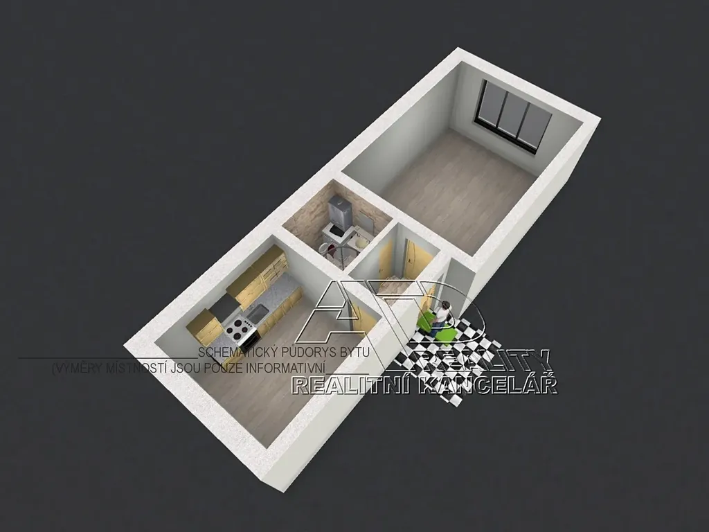 Dispozice: obytná místnost – pokoj [22.3m2], obytná kuchyně [11.8m2], předsíň [2.3m2], koupelna s WC [3.6m2].