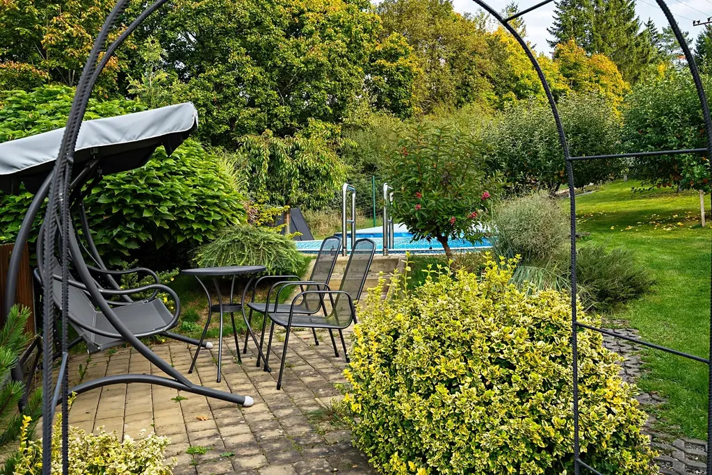 - zahradní domek s teráskou, velký sklad vedle terasy domu - celkově mnoho úložných prostor a prostoru pro vybudování dílny a podobně