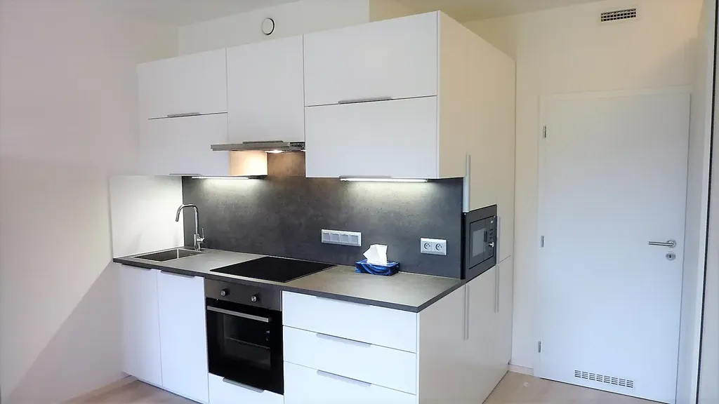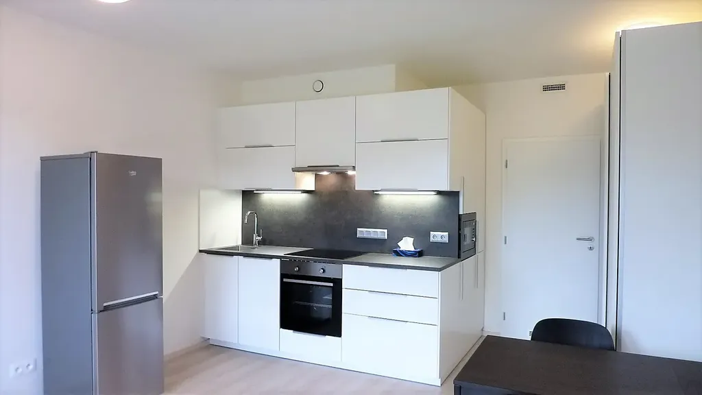 Exkluzivně nabízíme k pronájmu byt 1+kk ve 4.patře cihlového domu v ul. Šífařská, v nově vybudovaném komplexu Rezidence Hodkovičky. V případě zájmu je možné si pronajmout i garážové stání ( cena 1.500,- Kč) Dispozičně je byt řešen jako 1+kk s balkonem. Majitelům se v rámci vybavení podařilo prostor maximálně vytěžit. Kuchyňská linka je vybavena veškerými vestavnými spotřebiči ( indukce, digestoř, myčka, trouba, mikrovlnná trouba), k dispozici je i samostatně stojící lednice s mrazákem. Kuchyň je zajímavě řešena a skýtá velké množství úložných prostor. Pokoj ( 22,6m2) s kk je dále vybaven - dvojdílná skříň, stůl a 2 židle. Koupelna a WC ( 4,4m2) jsou společné. Předsíň (3,1m2) je také vybavena skříní a odkládací stěnou s botníkem. Rezidence Hodkovičky nabízí vysoký standard, například plovoucí laminátové podlahy, plastová okna s šestikomorovým profilem či protipožární vstupní dveře 3. bezpečnostní třídy. Všechny byty jsou vybaveny také rekuperací, díky které je v domácnosti zajištěn stálý přísun čerstvého vzduchu. Ten je filtrován a ohříván teplem odcházejícího vzduchu. V každém bytě je tedy zajištěno zdravé větrání bez zbytečných tepelných ztrát. Dalším zajímavým a užitečným prvkem jsou venkovní žaluzie. Byt je orientován na západ a z balkonu je opravdu nádherný výhled. Pokud hledáte byt s dobrou dopravní dostupností, plně zajištěnou občanskou vybaveností a možností sportovního vyžití v těsné blízkosti, je tohle ta správná volba. V okolí je spousta cyklostezek, nedaleko golfové hřiště a spousta jiných sportovišť. K nastěhování ihned.