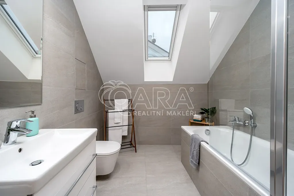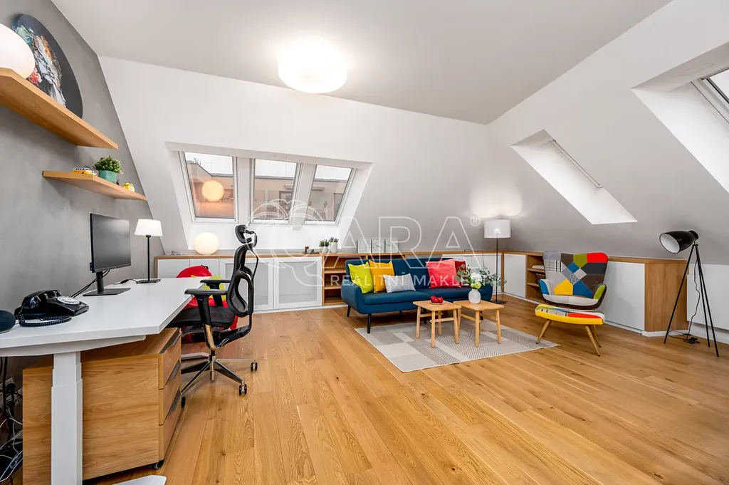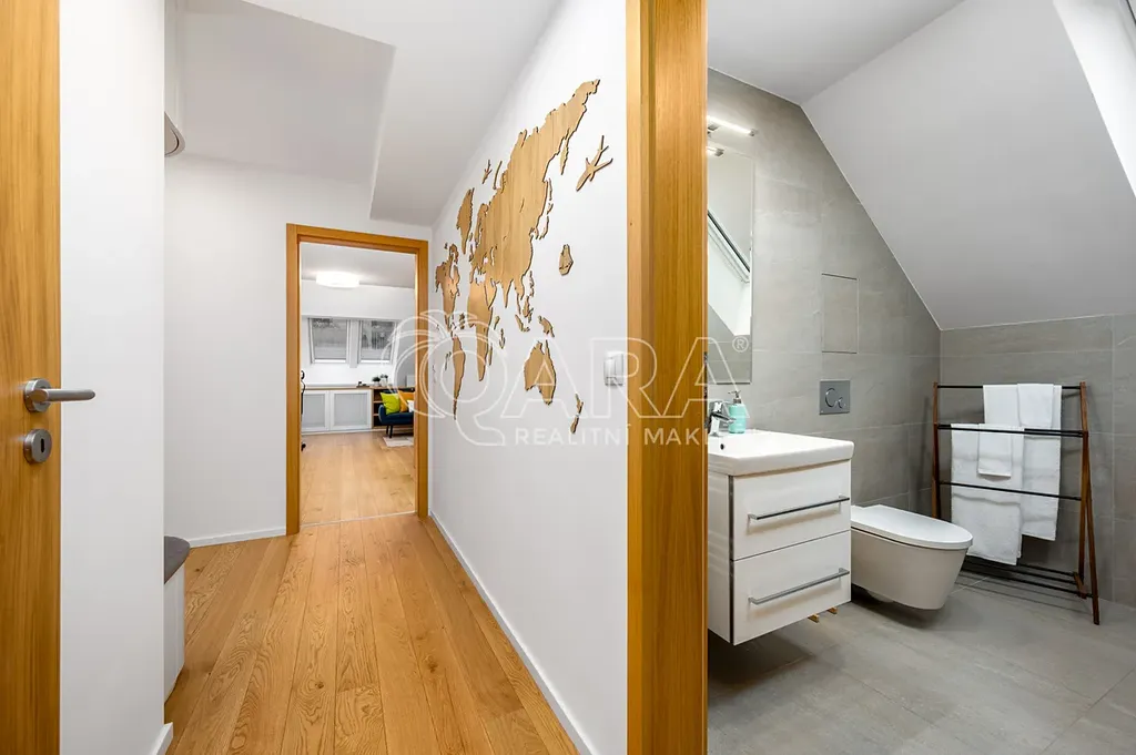 Na první pohled vás zaujme právě jeho otevřený prostor a příjemný charakter. To vše podporují citlivě zvolené materiály a důraz na moderní technologie s prvky chytré domácnosti. S ohledem na umístění v posledním patře se šikminami byl také kladen důraz na praktické řešení úložných prostor, které funkčně i esteticky dotváří praktičnost celého bytu.