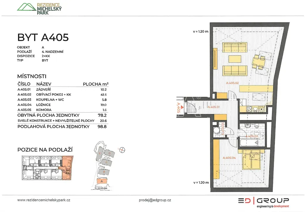 Pak je pro Vás ideální možností koupě prostorného bytu 2+kk o podlahové ploše 98,8 m2 umístěného ve 4. podlaží novostavby v projektu Rezidence Michelský Park z roku 2022.