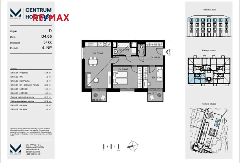 Byt je umístěn ve 4. NP ze čtyř a skládá se z obývacího pokoje s kuch. koutem (23 m2) - první balkon (3 m2), ložnice (12 m2), pokoje (8 m2) - druhý balkon (3 m2), koupelny s vanou (5 m2), odděleného WC (2 m2) a předsíně (13 m2). Byt je vybaven novou kuchyňskou linkou na míru s vestavnými spotřebiči BOSCH (myčka, trouba s funkcí páry, sklokeramická varná deska, digestoř, lednice, mrazák). V ložnici a předsíni jsou prostorné vestavné skříně a úložné prostory. Bytová jednotka je dále vybavena klimatizací, podlahovým topením a předokenními roletami na elektrický pohon. PENB je B.