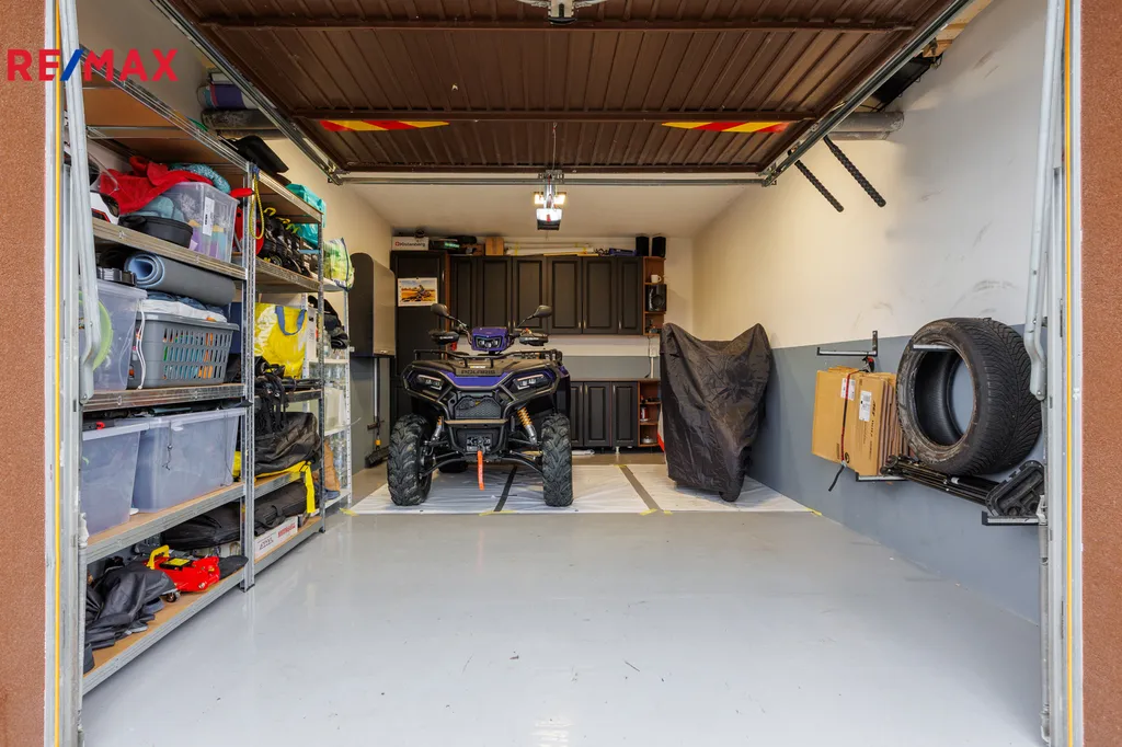 Velkou předností je vlastní garáž o velikosti cca 20 m², která se nachází přímo v budově a je vybavena elektrickým ovládáním vrat. K tomu navíc parkovací stání přímo vedle garáže, což je v dnešní době obrovský benefit.
