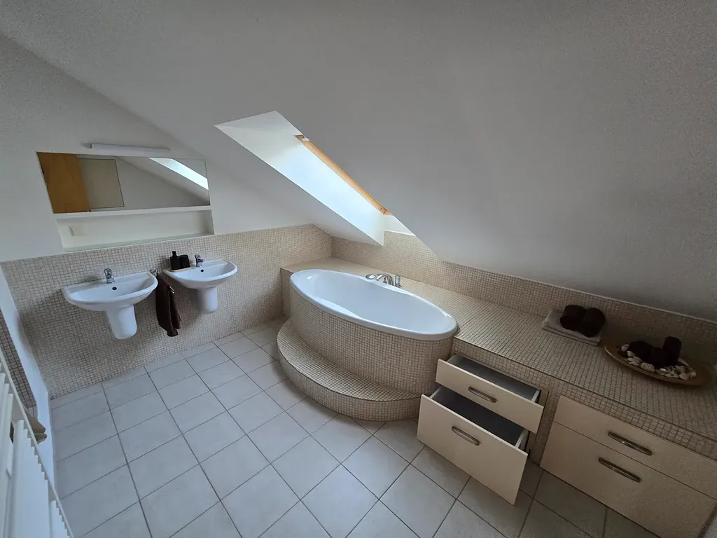 Interiér je doplněn designovými osvětlovacími prvky (zapuštěná světla), dále mnoha vestavěnými skříněmi, skříňkami a šuplaty, které poskytují dostatek úložného místa. Podlahy tvoří dlažba a laminátová podlaha. Vytápění a ohřev vody zajišťuje kondenzační plynový kotel. Zařízení bytu tvoří moderní kuchyňská linka s vestavěnými elektrospotřebiči – sporákem se sklokeramickou deskou, horkovzdušnou troubou, digestoří, myčkou a chladničkou s mrazákem. Koupelna s oknem umožňuje využít denní osvětlení a oválná vana příjemnou relaxaci ve slunečních paprscích.