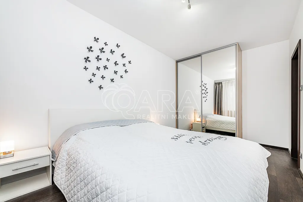 V ložnici se nachází prostorná vestavná šatní skříň, která vyplňuje celý prostor u zdi do výšky i šířky. Skříň je zrcadlová, prostor tak opticky zvětšuje a prosvětluje. Bylo pamatováno i na část skříně, kam se vejde žehlící prkno, vysavač či sušák na prádlo.