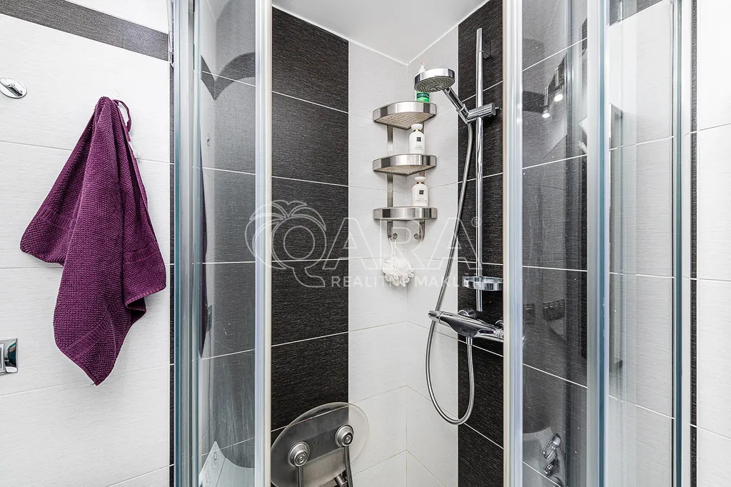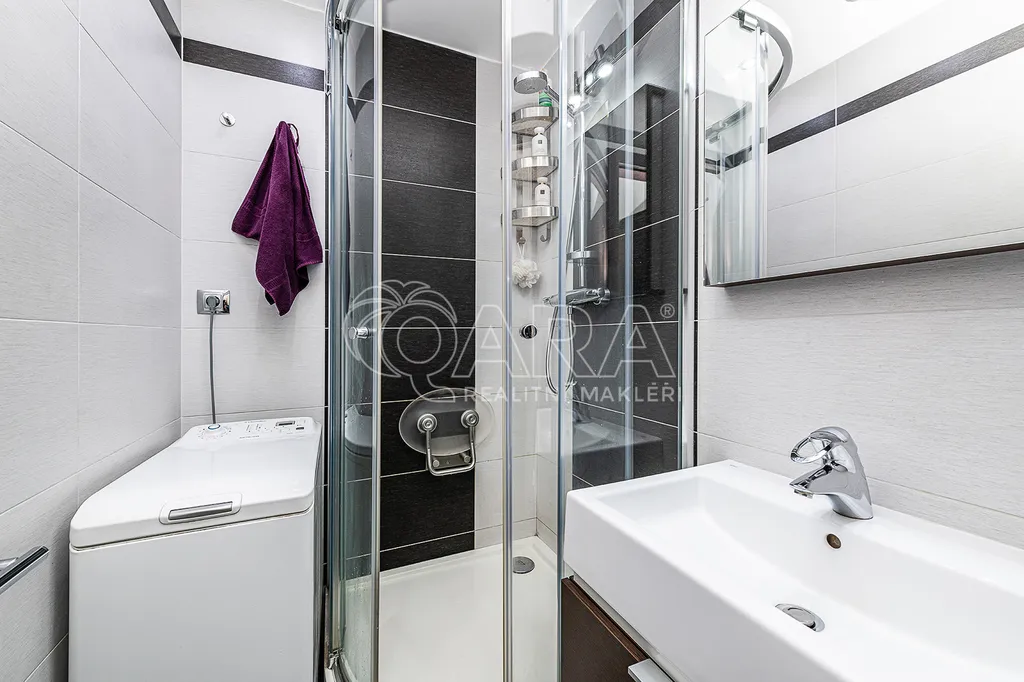 Koupelna prošla při kompletní rekonstrukci dechberoucí proměnou, která znamenala změnu dispozice i nadčasový design. Kombinace bílých velkoformátových obkladů, , elegantní baterie, obdelníkové bílé umyvadlo a zrcadlo. Zvětšený sprchový kout je opatřen skleněnými dveřmi a celodenní únavu můžete ze sebe smýt pod sprchou se systémem padajícího deště na přídavném sedátku. Toaleta je se systémem Geberit.