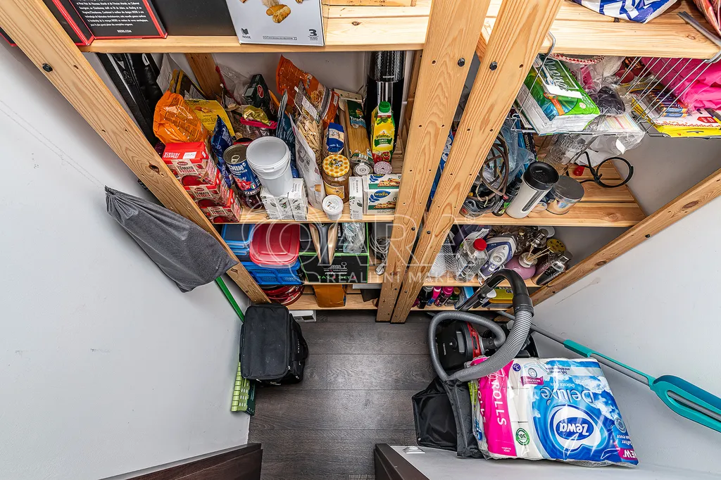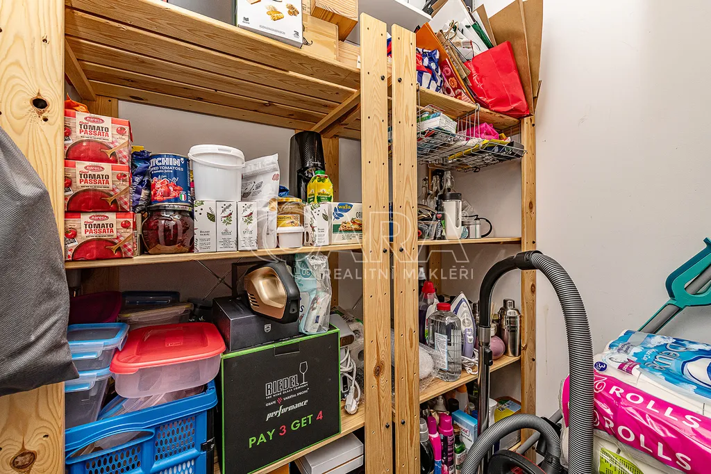 V bytě je komora na uložení věcí na úklid a ostatních nepotřebných věcí prakticky umístěná naproti kuchyňskému koutu.
