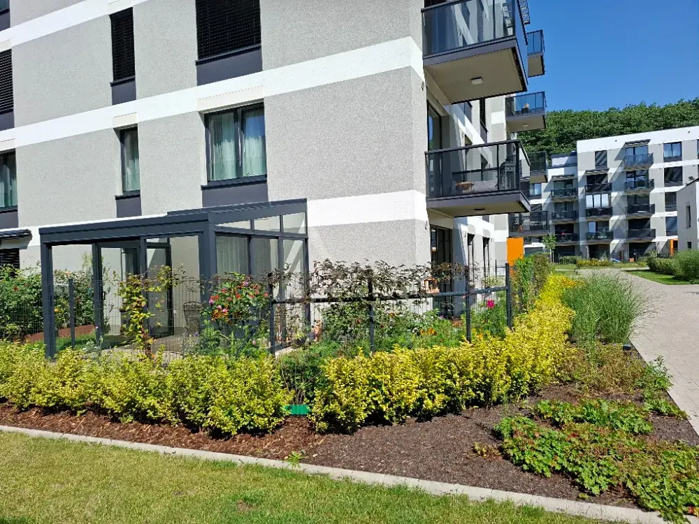 Na zahrádce, na kterou je i vlastní vstup přes vrátka do vnitrobloku, je vyměněná původní zemina za novou a kvalitní, částečně osázeno, květináče osázeny růžemi, které tvoří v létě květinovou bariéru s plotem sousední jednotky (jediný přímý soused).