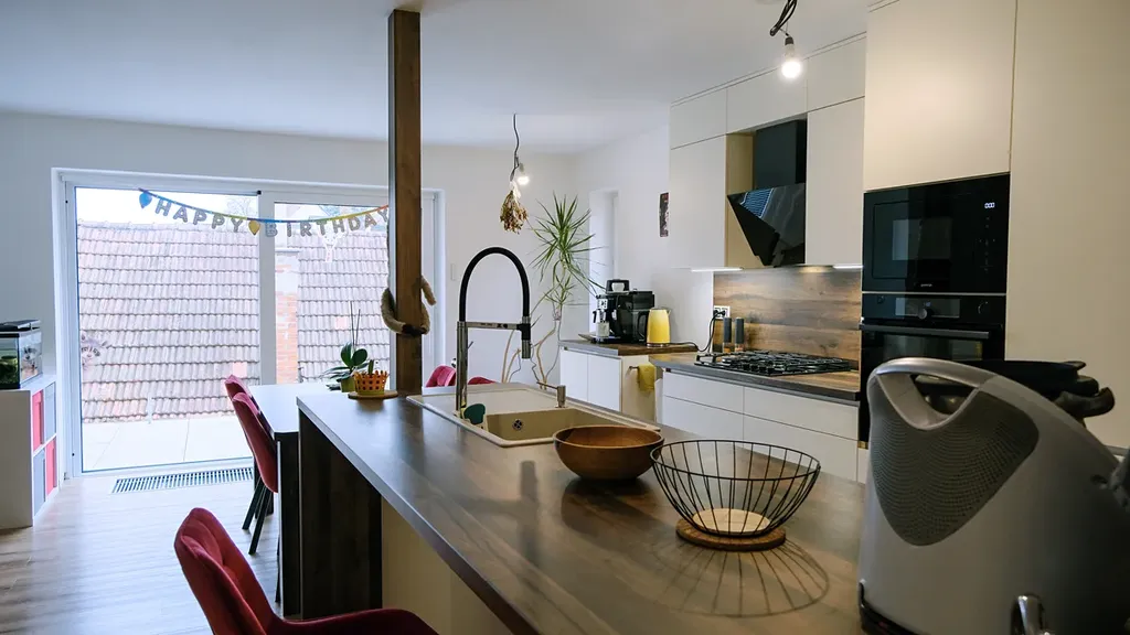 - chodba, koupelna - 2 x umyvadlo, sprchový kout, vana, samostatné WC, ložnice s vestavěnou šatnou vstupem na terasu, šatna, dětský pokoj, kuchyně s kuchyňským sezením a obývacím pokojem se vstupem na terasu (manuál.+ el. ovládání markýzy na terase), vstup na půdu