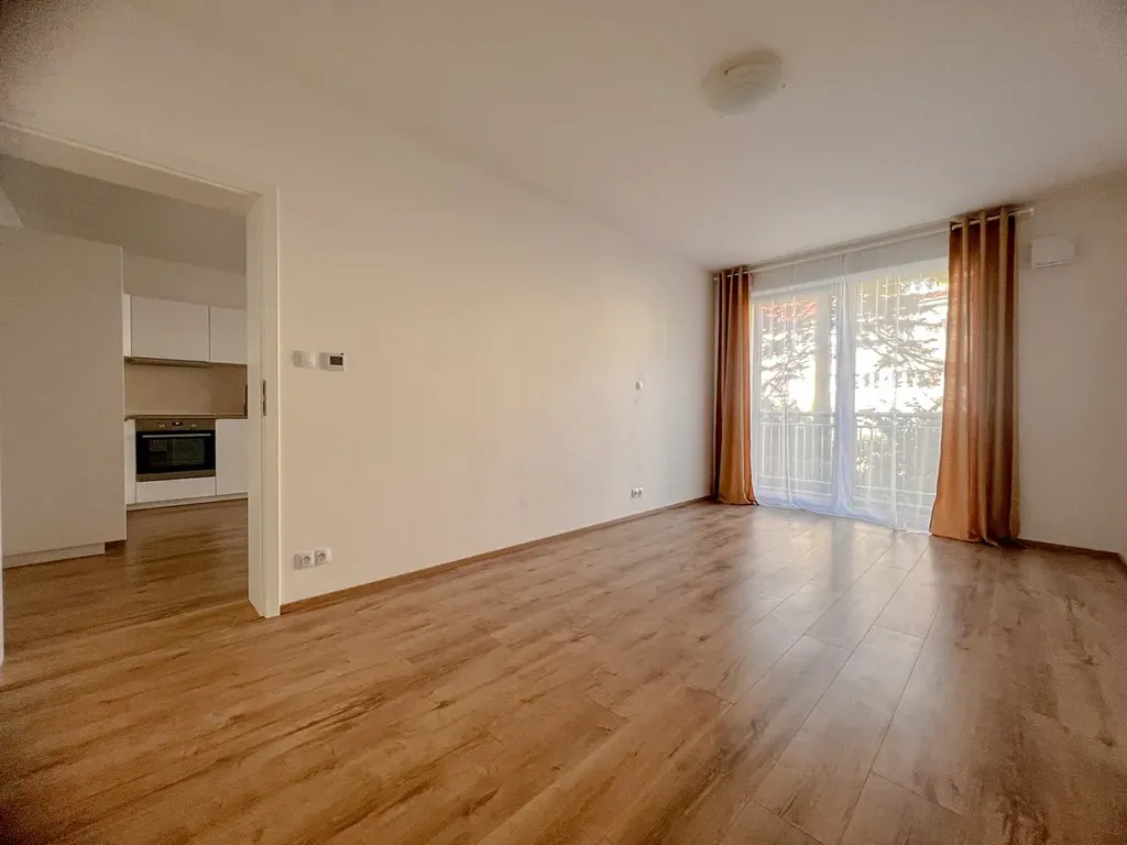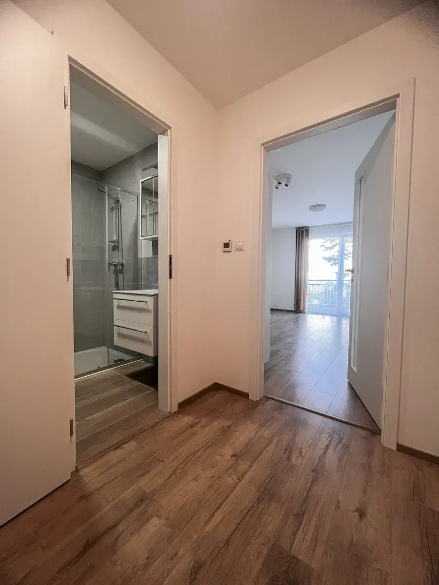 Dominantou bytu jsou velká francouzská okna, která přivádějí do interiéru dostatek denního světla a dodávají prostoru vzdušnost. Dispozice je řešena velmi prakticky – obytný prostor s kuchyňským koutem nabízí dostatek místa pro obývací část i jídelní stůl, a zároveň je zde samostatná šatna, díky které je úložný prostor vyřešen komfortně a bez nutnosti zaplňovat byt skříněmi. K bytu náleží také sklepní kóje a velkým benefitem je venkovní parkovací stání, které máte vždy po ruce.