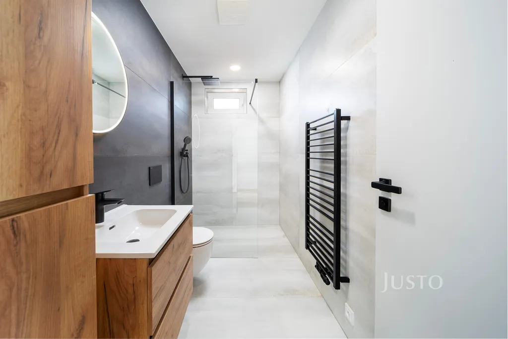O vytápění se stará plynový kondenzační kotel s podlahovým vytápěním. Díky kvalitnímu zateplení dům splňuje energetickou třídu B – velmi úsporná, což znamená nízké provozní náklady.