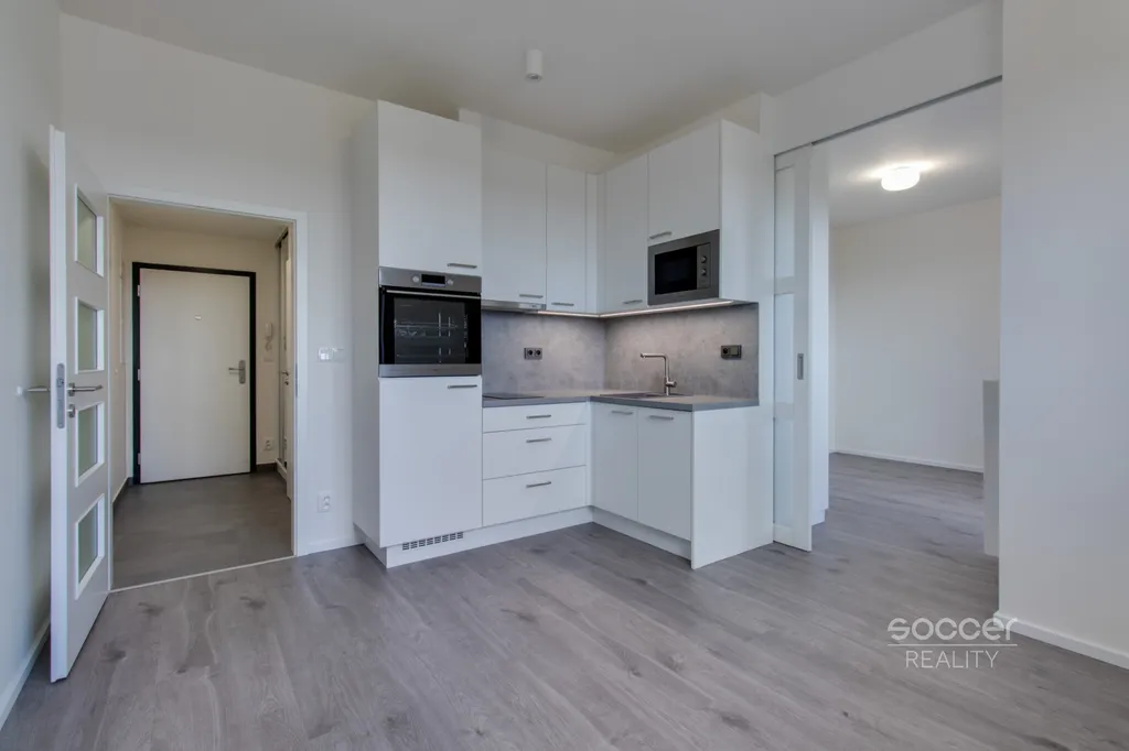 Soccer Reality vám zprostředkuje pronájem bytu v novostavbě o velikosti 1+kk a celkové výměře 34 m², nacházející se ve 4. nadzemním podlaží ze 4. Byt je k dispozici od 1. 2. 2026. Byt byl upraven tak, aby kuchyňský kout byl oddělen od pokoje elegantními posuvnými dveřmi, což zajišťuje více soukromí i komfortu.