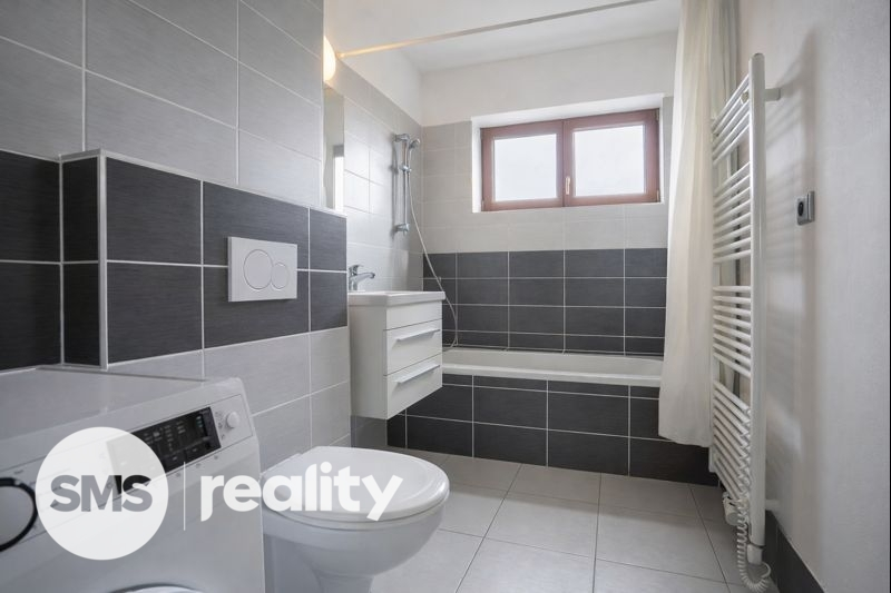 Koupelna s vanou, toaletou a topným žebříkem a pračkou. Byt působí světle a vzdušně. Velkou výhodou tohoto bytu je vstup na vlastní terasu s krásným výhledem.V bytě zůstává částečně vybavení, postel , jídelní stůl, obývací stěna, pračka, vestavěné skříně.