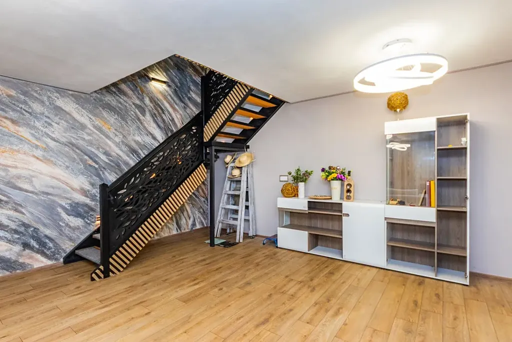Samostatně stojící dům se dvěma nadzemními podlažími a jedním podzemním podlažím nabízí více než pět pokojů, dvě koupelny, domácí saunu a posilovnu, což zaručuje komfortní bydlení pro každou početnou rodinu.