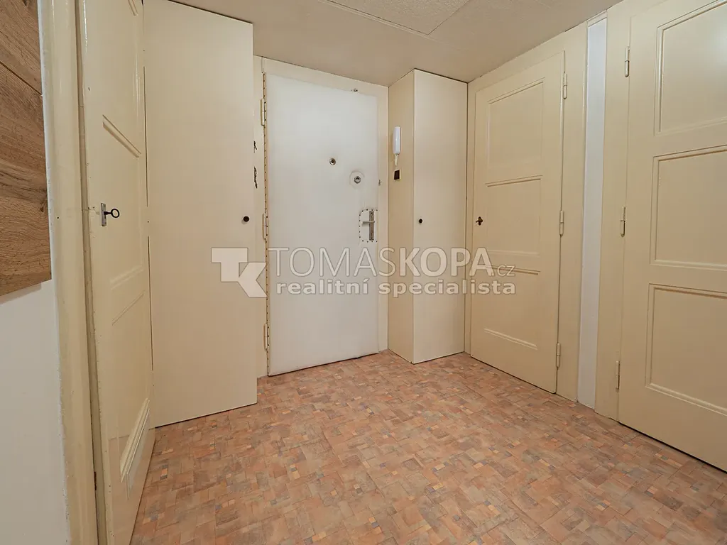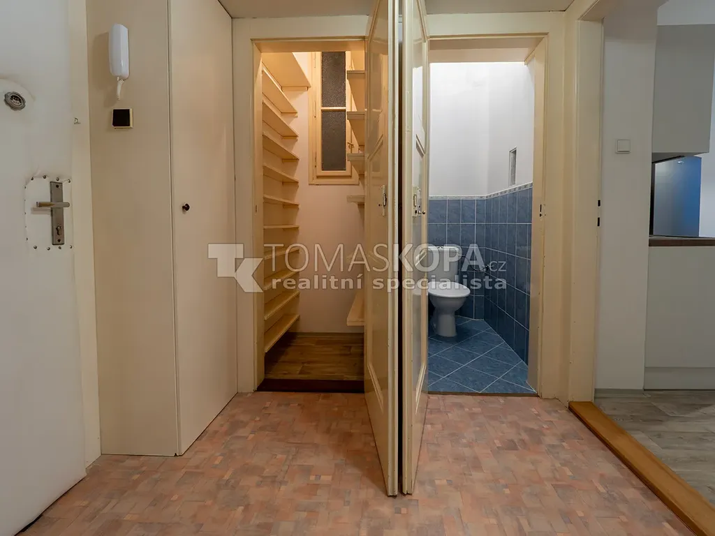 Pronájem nezařízeného bytu s dispozicí 1+1 s výměrou 40,4 m², který je ve 2.NP činžovního domu s výtahem v ul. Koulova, Praha 6 – Dejvice. Byt sestává z kuchyně (16,4 m²), kuchyň je vybavena varnou deskou, sporákem, myčkou a lednicí. Dále je v bytě předsíň (4,5 m²), koupelna s vanou a pračkou (2,1 m²), separátní WC (1 m²) a komora (1 m²) Dále je v bytě pokoj (15,1 m²). Další úložný prostor je nad sníženým stropem v předsíni. Vytápění je lokální plynové (WAW) a ohřev vody zajišťuje vlastní bojler. Součástí pronájmu je také velmi prostorný sklep (viz. foto).