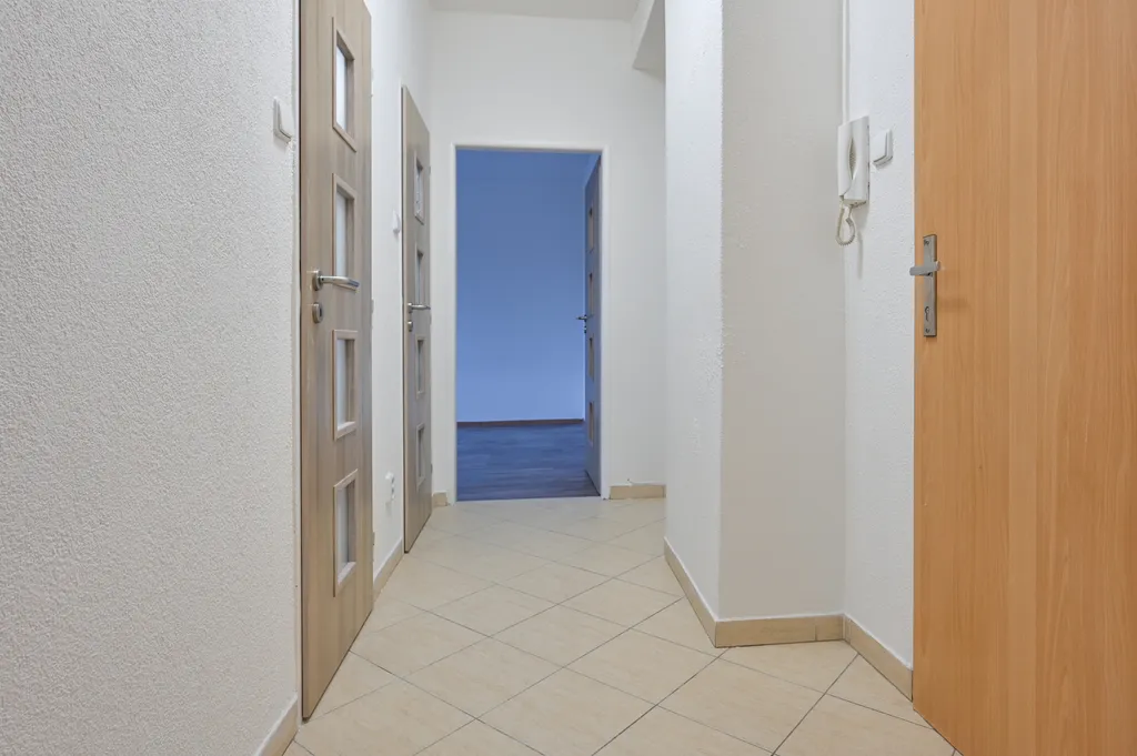 Byt je po částečné rekonstrukci. Jeden z pokojů je neprůchozí (ložnice). Druhý pokoj je průchozí směrem do kuchyně a je z něj přístup na balkon. Kuch. linka je prostorná, rohová. Koupelna s velkou rohovou vanou, přípravou na pračku. Toaleta je zvlášť. V pokojích jsou plovoucí podlahy, byt je nově vymalován a připraven k nastěhování.