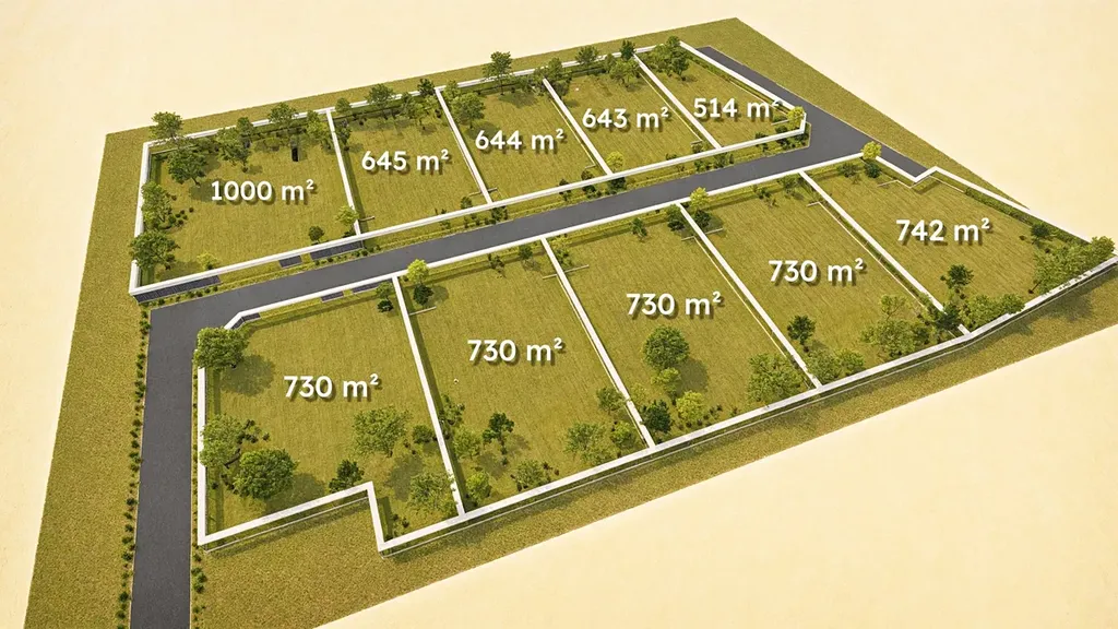 Základní členění nabízí 10 stavebních míst se středovou příjezdovou cestou. Rozměry pozemků jsou od cca 514 m2 do 746 m2 a budou kompletně zasíťované v druhé polovině r. 2026.