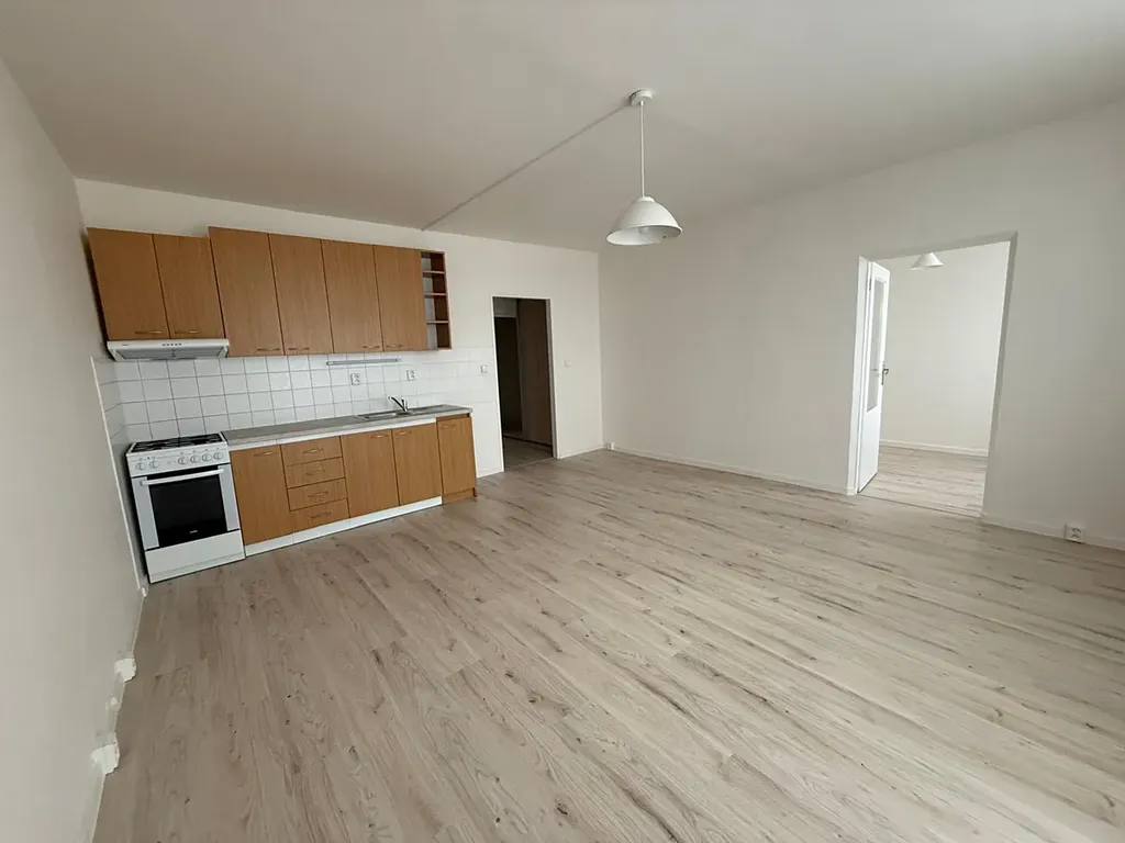 Dispozice bytu zahrnuje plně vybavenou kuchyň se spotřebiči, koupelnu s pračkou a vestavěné skříně v předsíni, které poskytují dostatek úložného prostoru. Díky umístění ve vyšším patře je byt velmi světlý a působí vzdušně.