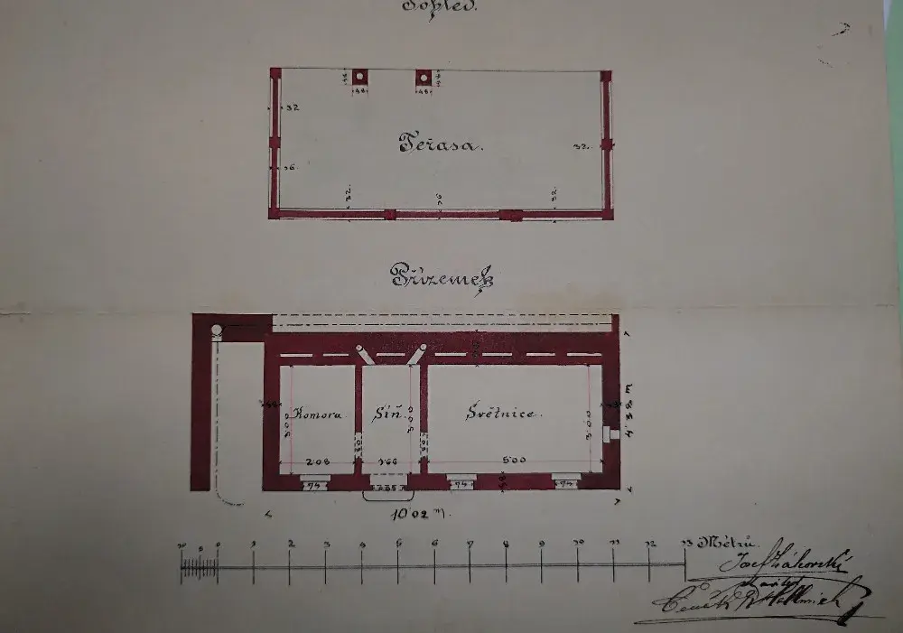 půdorysem a plochou střechou stojí na vlastním pozemku, který je součástí