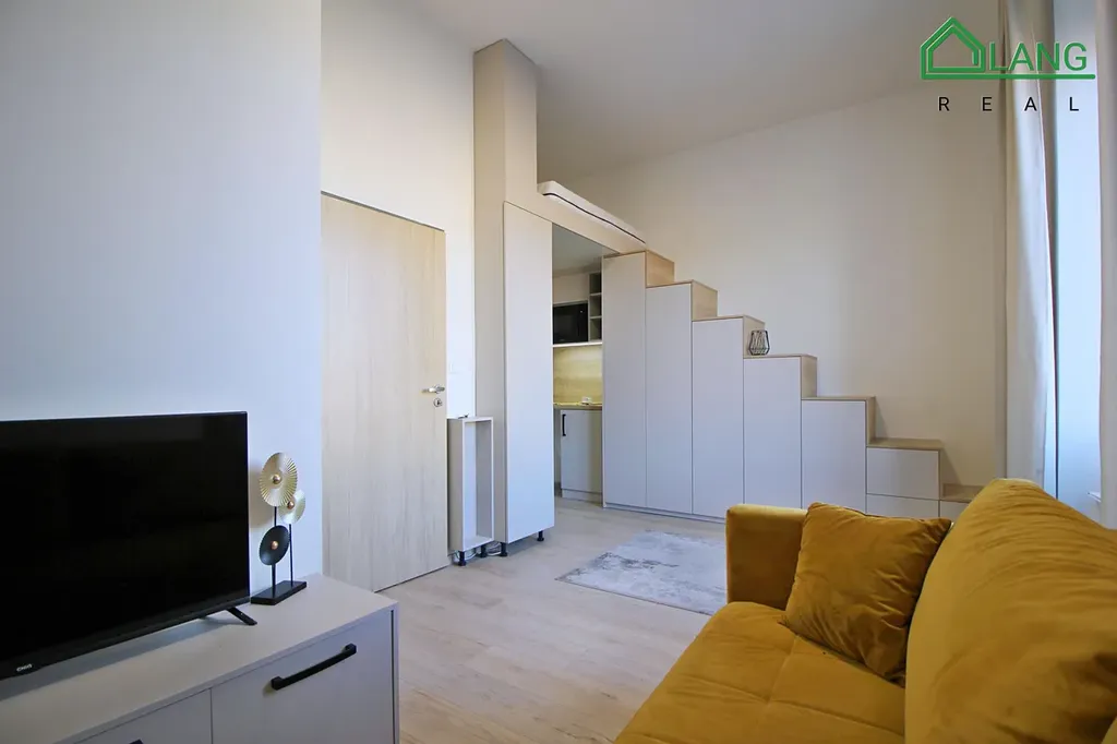 Obývací pokoj se spacím patrem a důmyslně navrženým úložným prostorem zabudovaným ve schodech do patra dále nabízí pohodlné posezení s knihou na elegantním gauči nebo sledování filmů na televizi, která je součástí bytu. Spací patro je dost velké pro dvě osoby, je vybaveno pohodlnou matrací. Díky dostatečnému prostoru v patře je pro vyšší komfort zařízen další úložný prostor vedle matrace. Byt je orientován výhledem na Petrov, ranní káva u okna bude příjemný start dne.