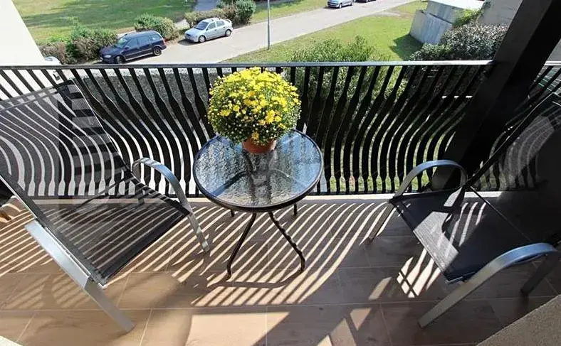 Celý prostor je prosvětlen francouzským oknem, kterým se vstupuje na balkon. Balkon s venkovním posezením je orientovaný do zahrady a poskytuje klid a soukromí.